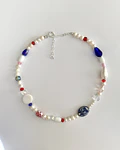 Collar hecho de diferentes materiales como perlas de rio, cristales facetados, cerámica y plástico. Su broche y cadena de ajuste son bañados en plata.