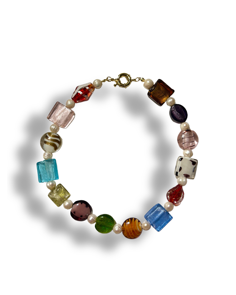 Materiales: Vidrio múralo, perlas de río y broche bañado en oro.